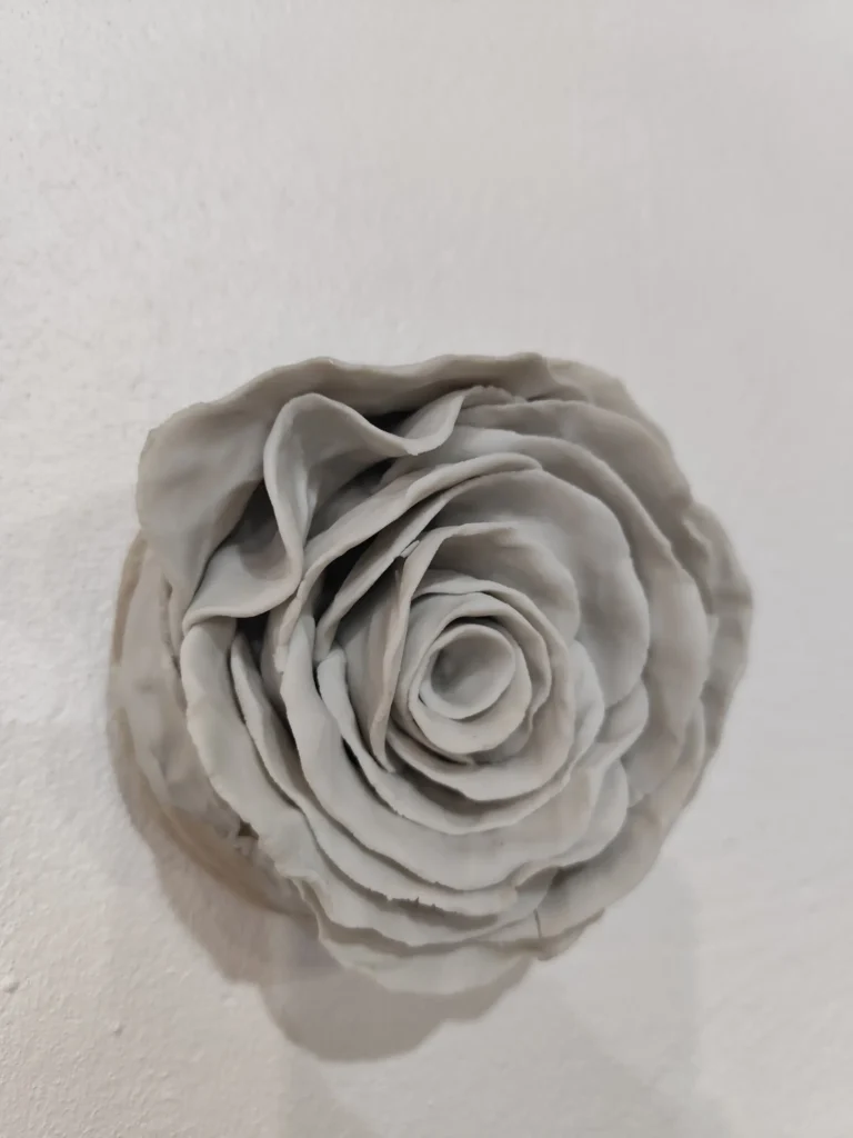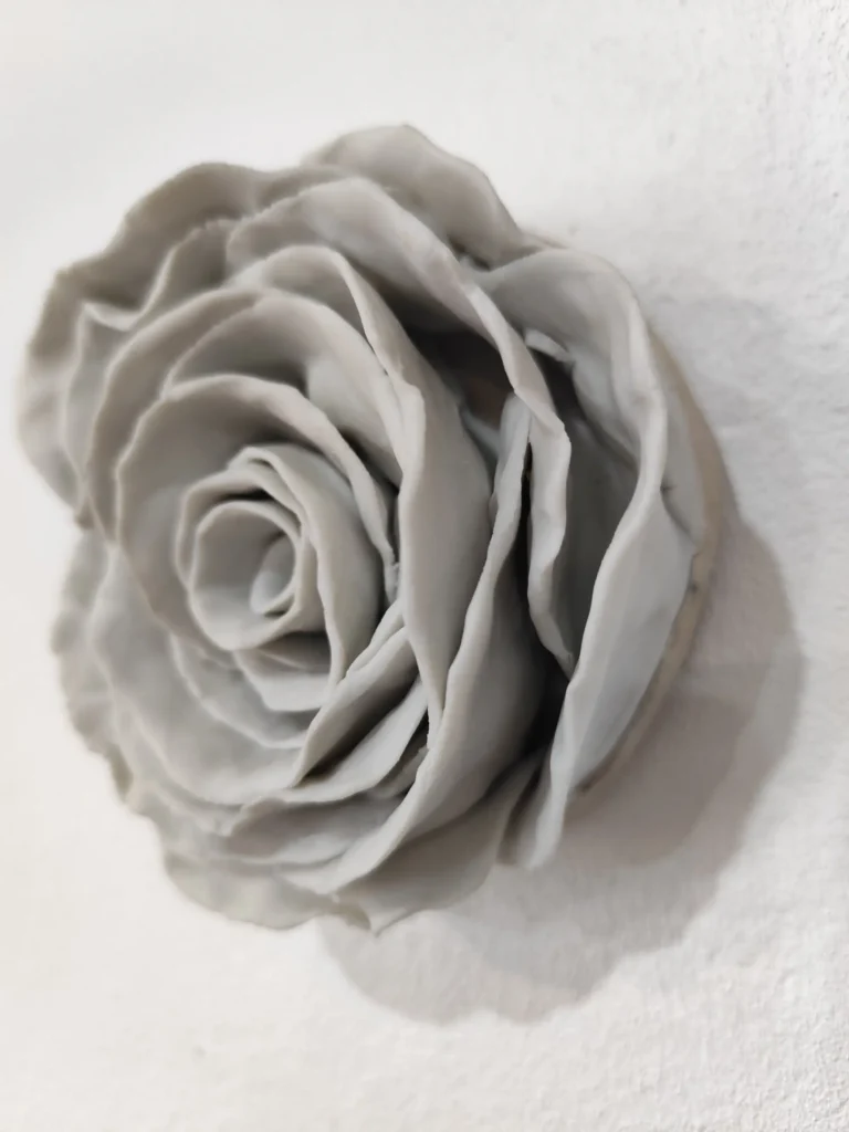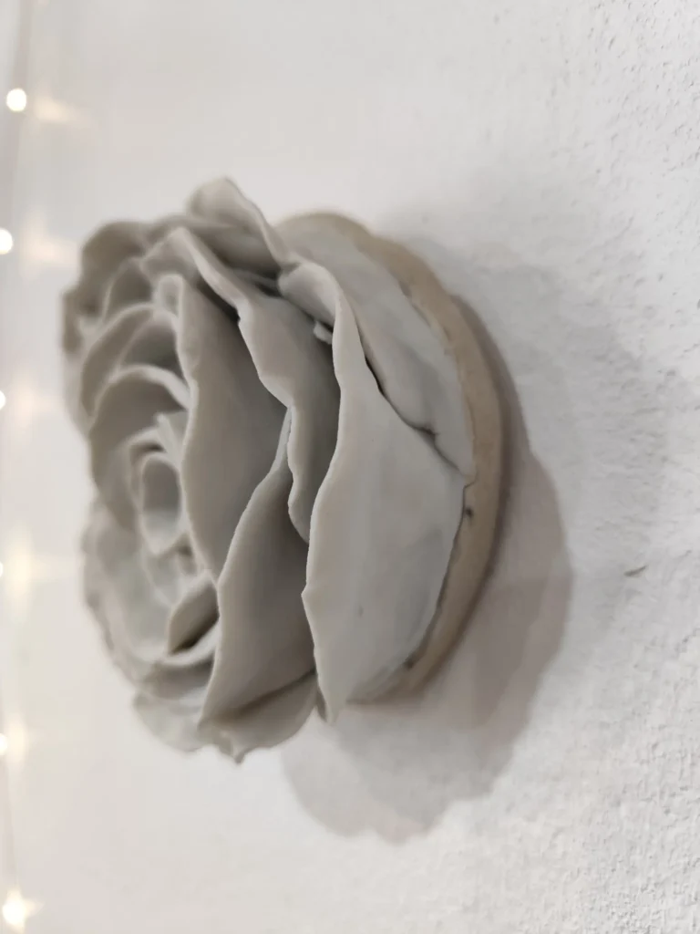 Adorno de pared con base de gres sobre la que se asienta una rosa de porcelana blanca. Cuenta con un ganchito en la base trasera para que se pueda colgar con facilidad aunque sea puede utilizar también sobre una superficie horizontal ya que asienta sobre la base.
