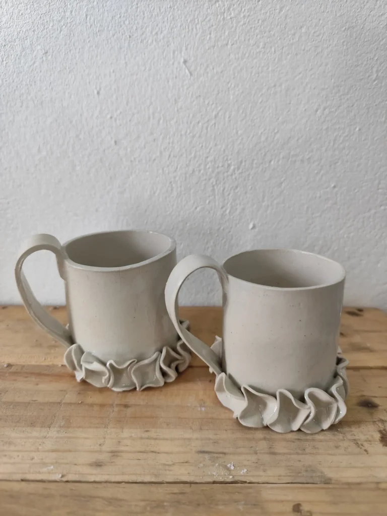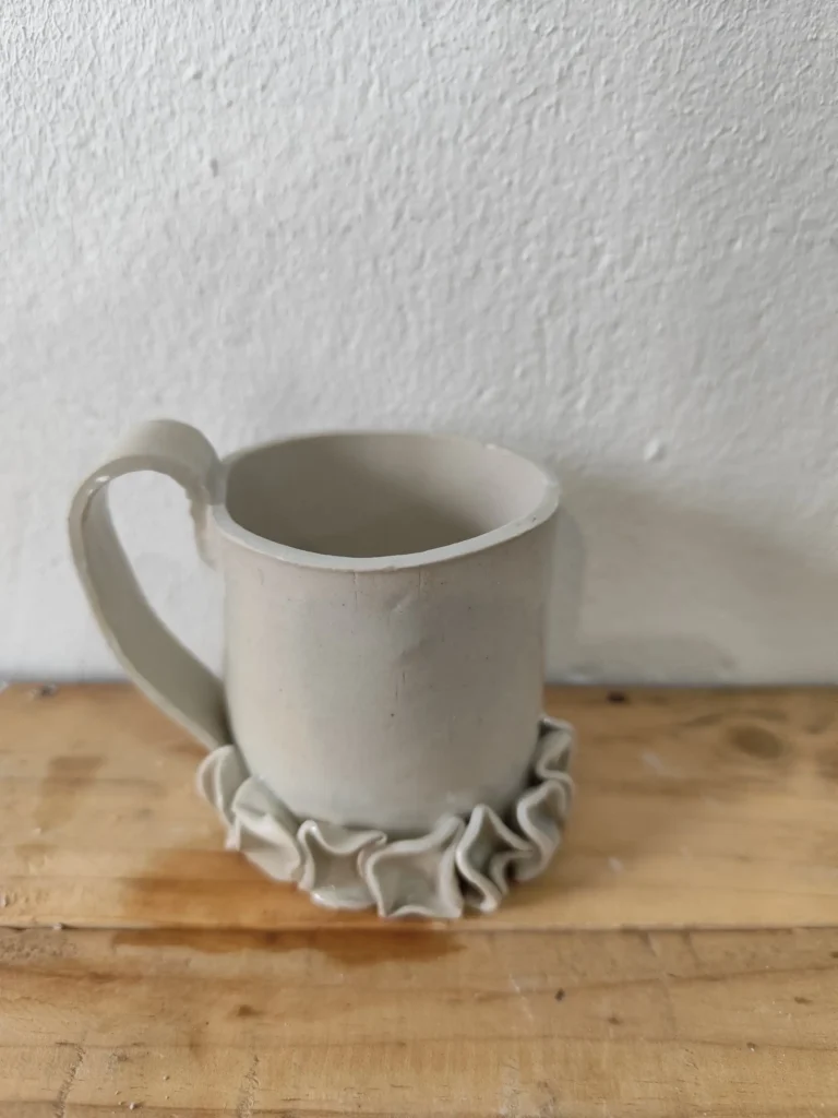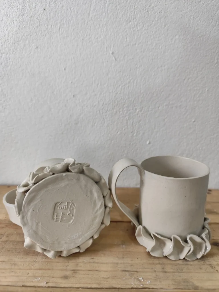 Taza modelada a mano con apliques de pétalos. Apta para lavavajillas y microondas.